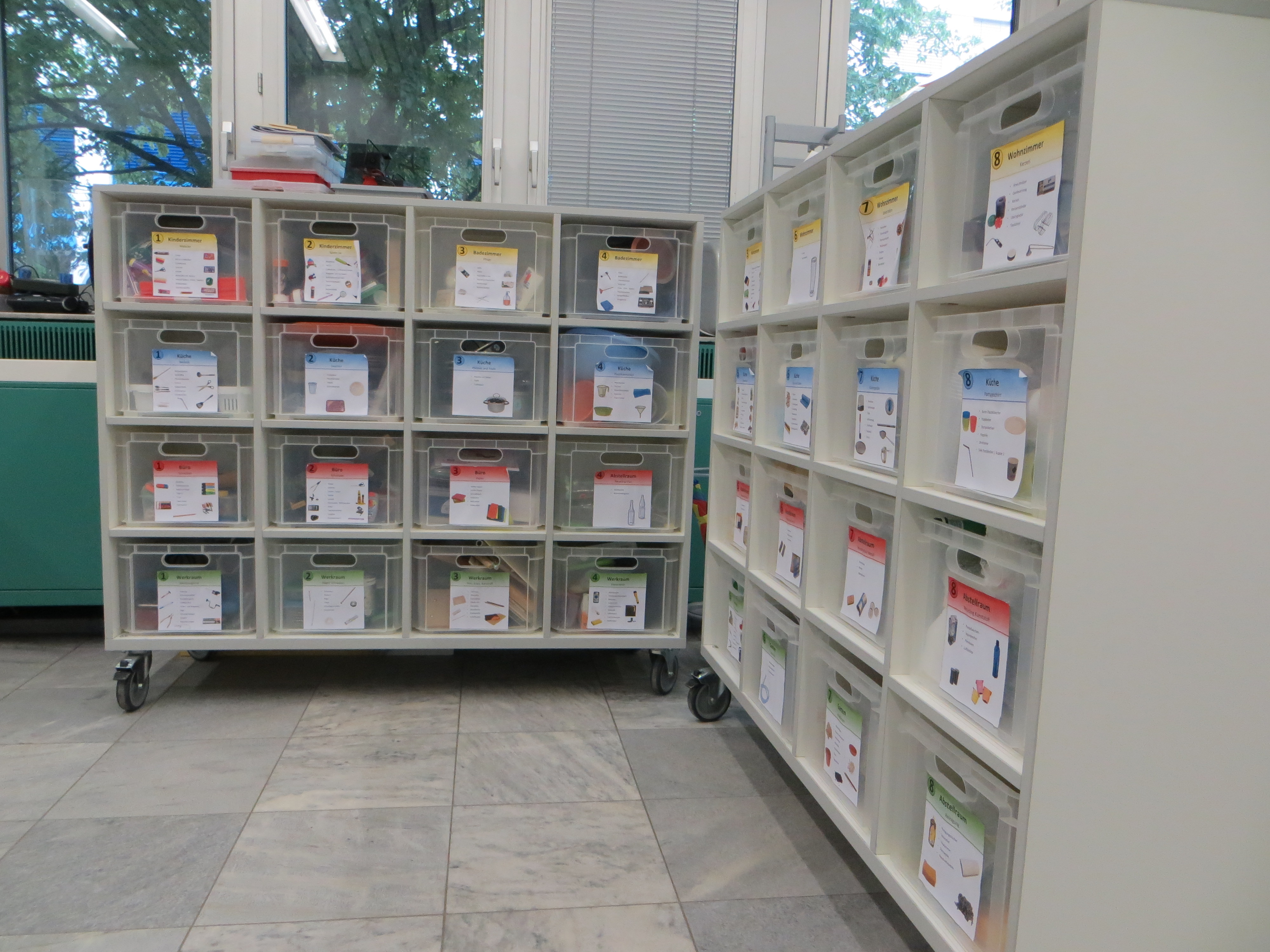 Die Materialien sind nach einem für jeden intuitiv nutzbaren Ordnungssystem in Boxen geordnet und das Material steht zum Einsatz bereit. Jede Materialbox steht für ein Zimmer eines Gebäudes mit entsprechenden Materialien, die auch im Haushalt in diesem Raum zu finden wären. Diese wird analog zur typischen Lage der Zimmer in einem Wohnhaus im Regal eingeordnet. So ist das Werkzeug in der Werkstatt im Keller und das physikalische Spielzeug im Kinderzimmer im oberen Bereich des Hauses zu finden. Da keine aufwändige Einführung in das Material- und Ordnungskonzept nötig ist, und sich alle Beteiligten von Anfang an sicher in der Sammlung bewegen können, erhöht sich die persönliche Freiheit der Lernenden beim Experimentieren. Piktogramme auf den Boxen erleichtern das Einsortieren der Materialien, auch für Kinder, die noch nicht lesen können. Sie erlauben auch Erwachsenen eine schnellere Orientierung.